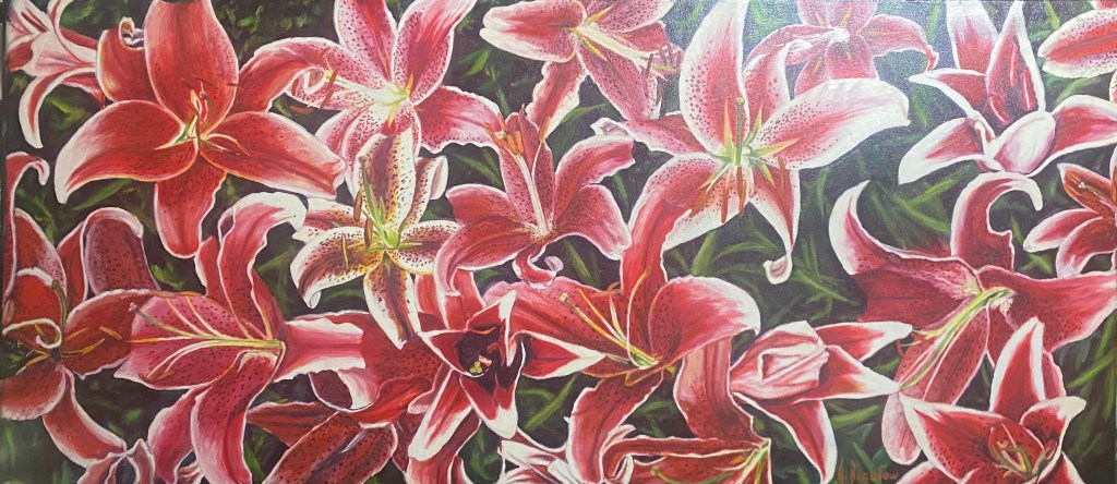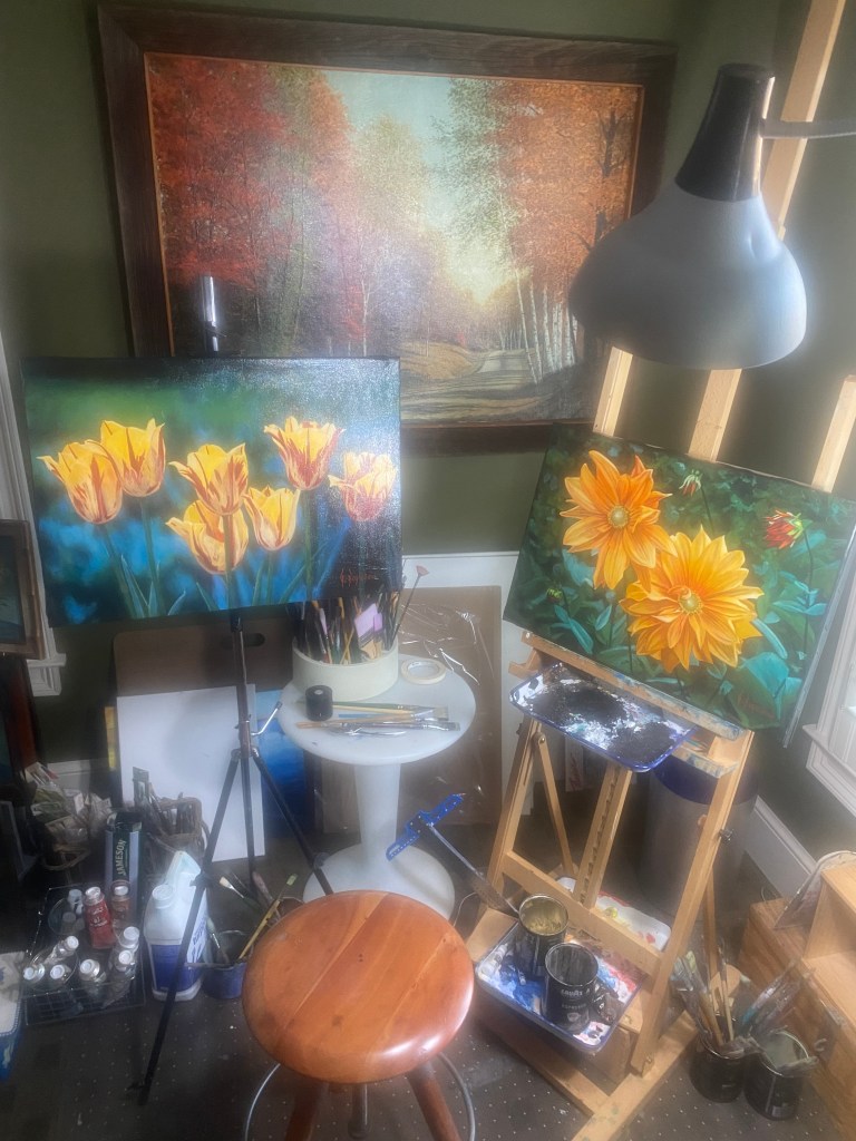 Of all those paintings, most were of flowers. As I’ve written here before, my dad would grow vegetables and flowers in the Spring and Summer and then oil paint during the harsh Adirondack Winters. I selected three paintings that I thought would look good together on a large, blank wall in Gavin and Chelsea’s new home’s entry way. One, of Stargazer lilies was quite long and large and the other two to accompany it on the left and right. They were a little dusty and the pigment was dulling but I knew all they needed was a little t.l.c.