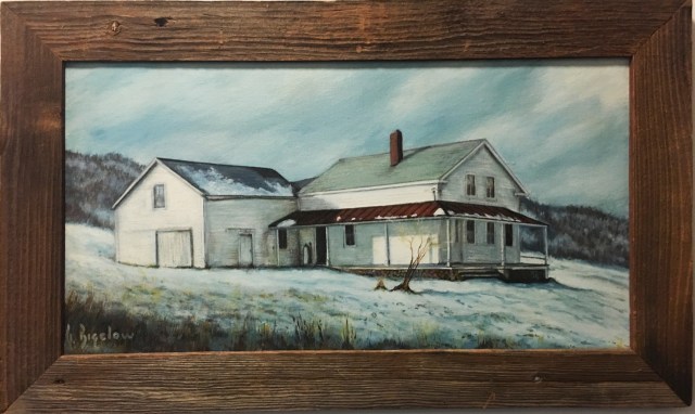 Galen Edward Bigelow inherited the Bigalow Hill property upon Ruth’s death. By this time it had fallen into disrepair, with the ancient barns toppling on the 100+ acres well into the early 2000s. The old farm house, with its’ slate roof and rough-hewn log timber frame still stubbornly stands having faced over two centuries of brisk, Northern winter winds. Many of his paintings document the crumbling and decay of the property.