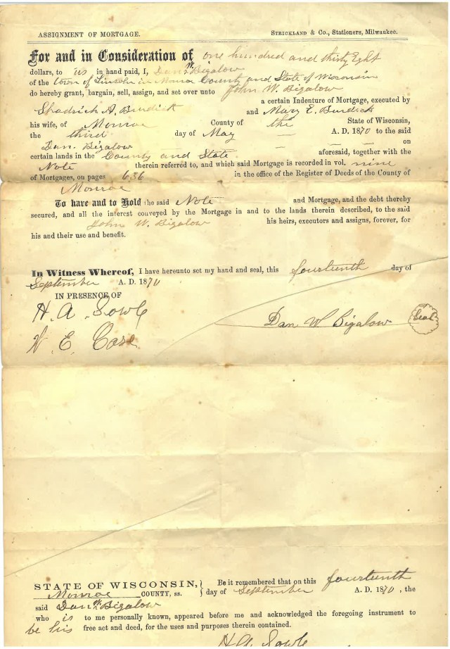 Joseph was a shoemaker and in later life a farmer. He and Catherine had fourteen children, several whom died young. The 1850 census shows Catherine living on Bigalow Hill with her son Amos, while Joseph, age 65 at the time, had moved west to his son Oscar’s home in Tomah, Wisconsin. It is believed Catherine did not make the move west because of poor health. She died on November 19, 1856 and is buried at Stevenson Cemetery approximately one mile from the Bigalow Hill family farm alongside today’s Route 9N. Joseph died in Tomah, Wisconsin in 1859. It is of interest that during the Civil War Amos Bigalow joined Company H, 5th Regiment, New York Cavalry which formed in Crown Point, N.Y. in 1861 while brothers Hiram O. “Bucko” Bigalow and Daniel W. Bigalow joined the Union cause in Wisconsin. Hiram in 1861 with the 10th Regiment, Wisconsin Volunteers and near the war’s end Daniel W. with the 49th Regiment Wisconsin Infantry.